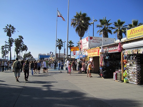 The 1.5 mile Venice Beach Boardwalk in Southern California has no shortage of sights. Though it has no rides or carnival games, street performers and vendors are abundant. Performers breakdance and walk across broken glass, mimes put on a show and musicians share their talent with the public.